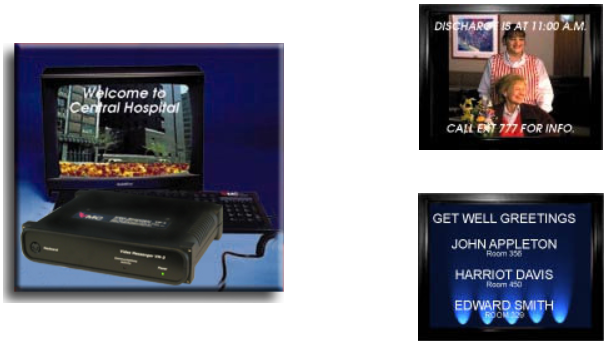 Hospitals, medical centers and senior care facilities throughout the United States have found Video Messenger's Electronic Bulletin Board to be an invaluable tool. It saves time for patients as well as staff by informing everyone in the facility about activities, menus, rehabilitation schedules, discharge procedures, etc. It allows the medical staff to air educational videos on a regular basis for patients with special care requirements. It is like having a customize message board in every room. Find out why hospitals like Lennox Hill in Manhattan, NY, Stamford Hospital in Stamford, CT and Zale Lipshy University Hospital in Dallas. TX, Chester County Hospital, PA use the Video Messenger Information Channel. Depending less on staff performance, managers can have a more reliable system to deliver their information throughout the facility.